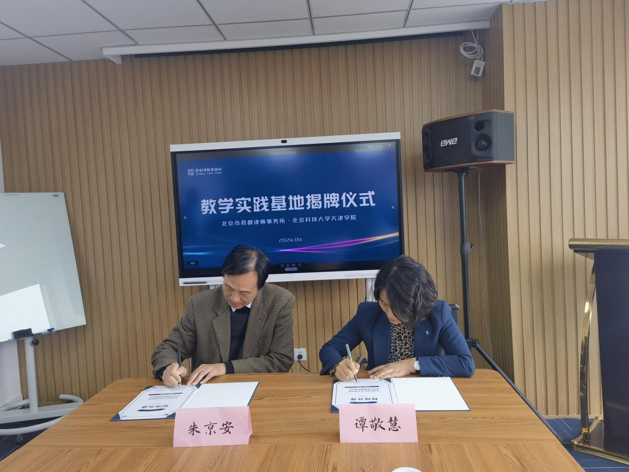 2024年4月3日下午,天津学院法律系主任朱京安、产学研办公室主任彭鹏及法律系刘国平、何人可、林铁军、李春光等教师赴北京君都律师事务所参观交流,与北京君都律师事务所签署合作共建协议,并为教学实践基地揭牌。