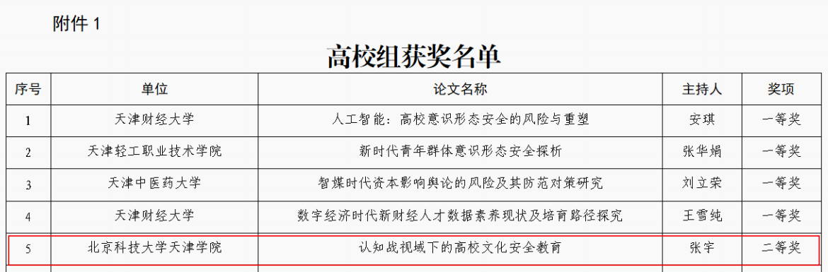 近日,天津市教育两委公布全面加强国家安全教育论文获奖名单,新葡京官网教师张宇撰写的论文《认知战视域下的高校文化安全教育》荣获市级二等奖第一名。