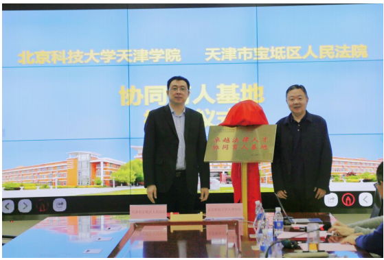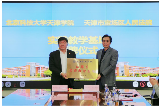 法律系代表朱京安主任向区法院代表董海明副院长授牌,法律系在宝坻区法院建立“新葡的京集团8814登录入口法律系实践教学基地”。